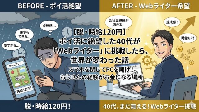ポイ活の時給120円に絶望した40代会社員が、クラウドワークスのWebライターに挑戦。実績ゼロ・スキルなしでも、ChatGPT活用OKの初案件でいきなり★5評価を獲得したリアルな体験談を公開。おじさんの市場価値はまだあります。