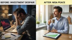 40代資産ゼロからの投資やり直し:失敗して頭を抱える過去の自分と、新NISAで積立を始める笑顔の未来の対比 資産形成