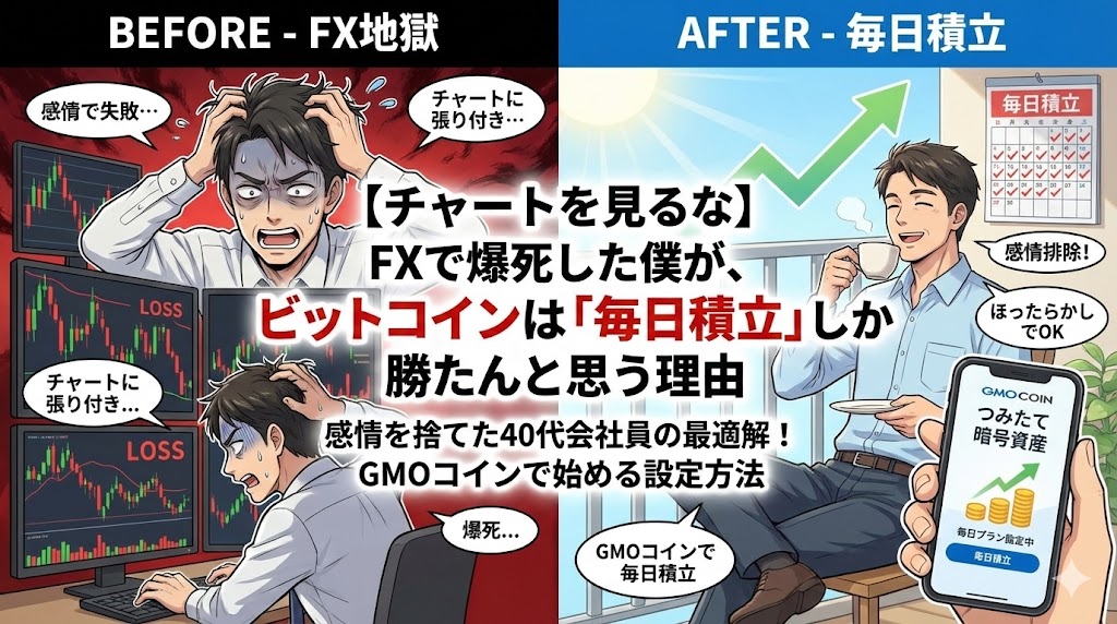 そんな「投資でボロボロになった40代会社員」が行き着いた、心の平穏と資産形成を両立させる唯一の答え。 それが、GMOコインを使った「ビットコインの毎日積立」です。